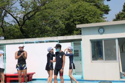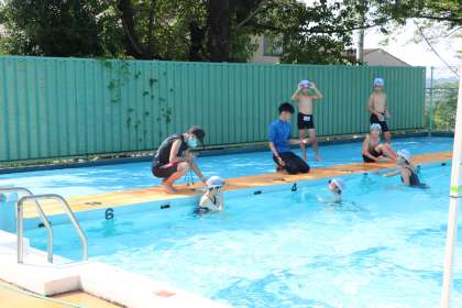 目標タイムで泳ぐことが検定項目になっている級もあります。何秒かの違いで残念がる子も、今日は再挑戦できるので、がんばります。
