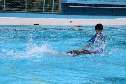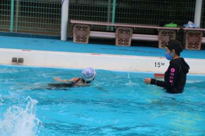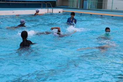 今日もたくさんの先生たちが水泳指導に来ています。夏休みは少人数で、しっかり泳法などを指導できるので、がんばったぶん、ぐんっと上達します。
