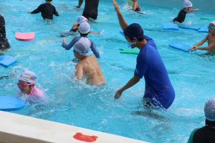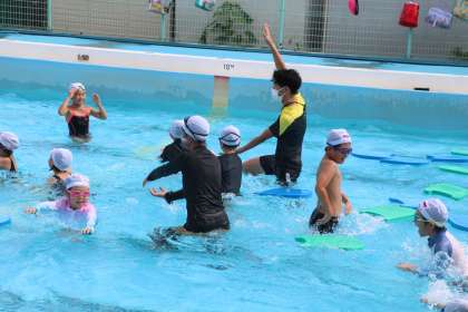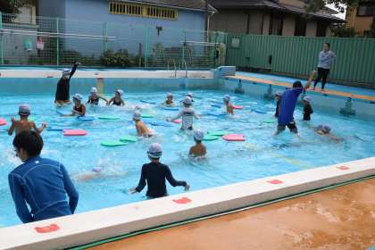 ビート板がたくさん浮いているプールの中を、ビート板に触らないように歩きます。のんびりしていると「先生ワニさん」につかまってしまいます。
