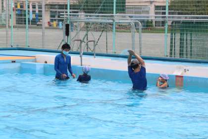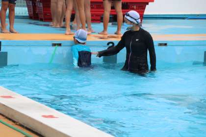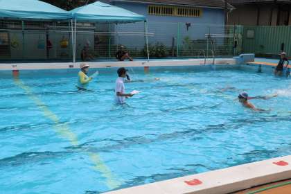 今日もたくさんの先生が水泳指導に来てくれています。一人ひとりの課題に沿って何度も練習したり、検定に挑戦したりできます。