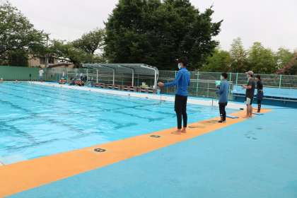 それぞれの泳法と距離によって目標タイムが違うので、今日もたくさんの先生が計測してくれます。プールサイドでは声を出さない代わりに手拍子で応援しています。