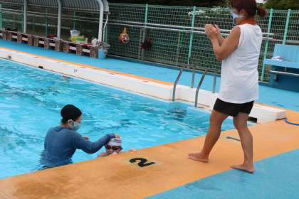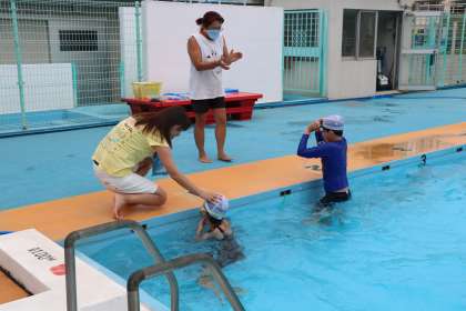 目標達成した子と一緒に、先生も大喜びです。帽子に進級バッジを付けてもらいます。