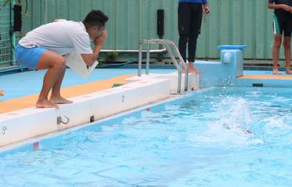 プールサイドから思わず先生が大きな声で激励。