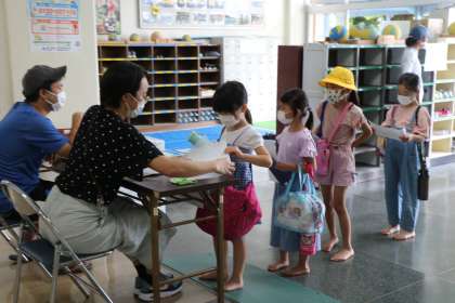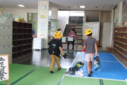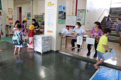 夏季水泳教室もいよいよ今日が最終日です。突然の雷雨やなかなか気温の上がらない雨の日もありましたが、暑い夏休み、先生たちの熱い指導に、子どもたちの泳ぎもぐんぐん上達しています。今日1回目は1年生、検定です。