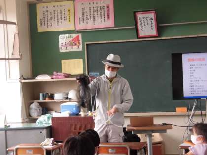 中村はちべえ先生をお招きして、ミツバチのこと、養蜂家の仕事、ハチミツのことをクイズを交えて教えていただきました。「へえ、そうなんだ!」とびっくりしたり感心したり。楽しい時間を過ごしました。