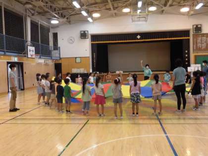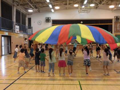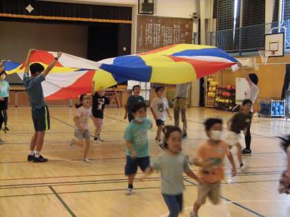 みんなで息を合わせてパラバルーンをもちあげると・・・ふんわりと高く広がります!成功した後は、パラバルーンをくぐって競争です。