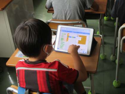 「将棋好きのためのプログラミング」の講座の様子です。「スクラッチ」で楽しく将棋の駒の動かし方を試し、プログラミングに挑戦していました。