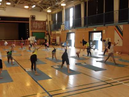 「みんなで朝ヨガ」の講座の様子です。朝から涼しい気温の中、ヨガマットをお借りして本格的なヨガに挑戦しました。