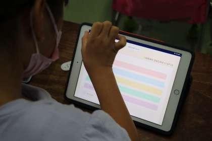 係決めでは、タブレットのアンケート機能を使って係に立候補を打ち込んでいます。真剣に悩んでいます。集計の様子がグラフで見れるので、どの係が希望者が多いか、全体の様子を見ながら週末も考え変更してもいいそうです。月曜日にみんなで決めるそうです。