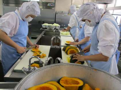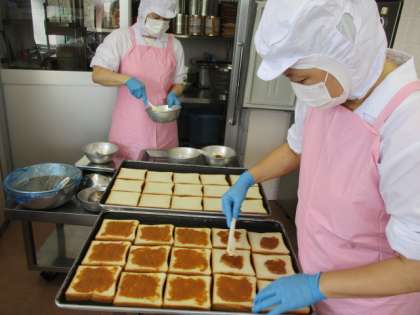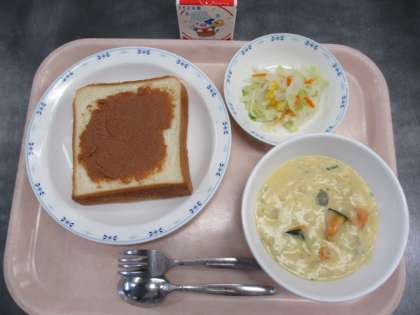 かぼちゃは5月から9月が旬の夏野菜です。旬のかぼちゃを使ってパンプキンシチューを作りました。とりがらからスープをとり、ルウも手作りするシチューは人気のある献立のひとつです。きなこバタートーストはきなことバター、砂糖を合わせたものを食パンに塗ってから、オーブンで焼きました。