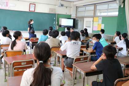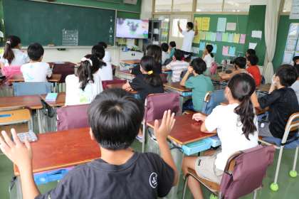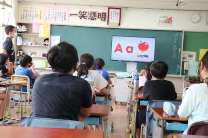写真は5年生、5年生、6年生の外国語学習の様子です。