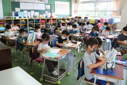 1年生・国語の様子です。教科書の文書の範読を聞きながら教科書を見て、心の中で一緒に読んでいます。指や鉛筆で字を追いながら集中している姿に、成長を感じます。
