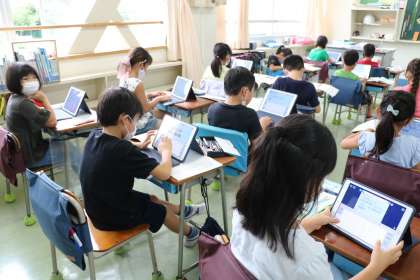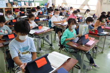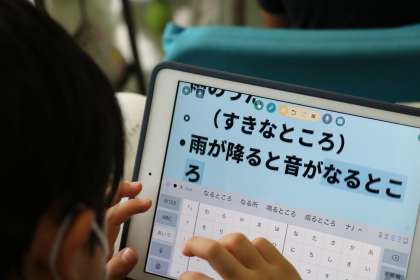 詩を読んで感じたことをタブレットに書き、全員で交流します。同じ詩を読んでも、好きな部分、不思議だと思った部分、感じたことはそれぞれ違います。たくさんの友達の感想が一堂にわかって、さらに自分の感じ方も広がります。