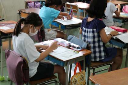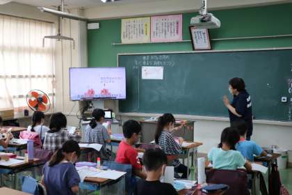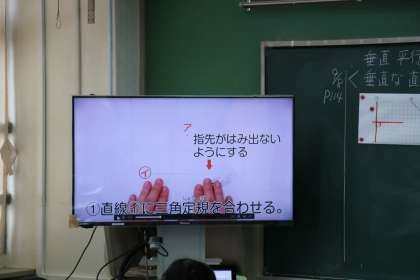 4年生の算数の授業です。今日は、平行な直線のかき方を学習していました。大型テレビで映し出された動画をよくみて丁寧にかくことができました。