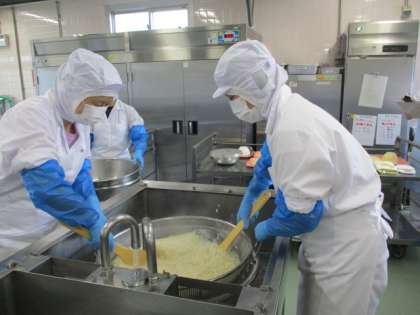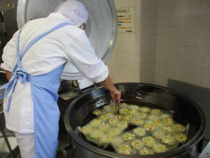 つけめんは全体で約140kgのうどんをゆでてから水で冷やして作りました。水は4回替えてやっと冷えます。かきあげもひとつひとつ材料から作りました。具には、さつまいも、ちりめんじゃこ、ちくわ、たまねぎ、にんじんが入っています。さつまいもの甘みとさくさくとした食感がおいしいかきあげができました。