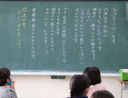 砧小の先生たちは、朝、子供たちが教室へ入ってきたときに、パッと目をやる黒板に、様々なメッセージを書いています。今日の時間割や今日の予定、先生からの励ましの言葉であったり、名札を忘れずつけよう!と、全員分の名札が貼ってあったり。