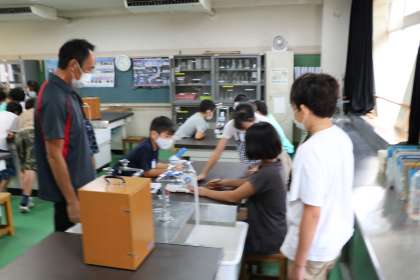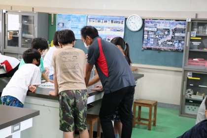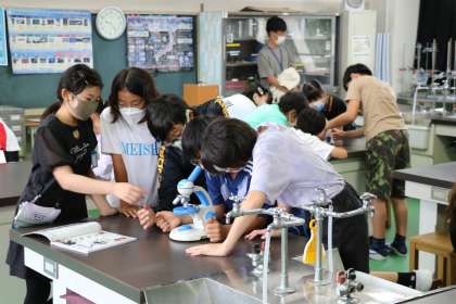 5年生の理科の授業の様子です。おしべとめしべの特徴を顕微鏡を使って観察していました。各班で教科書の手順を確認しながら観察していました。