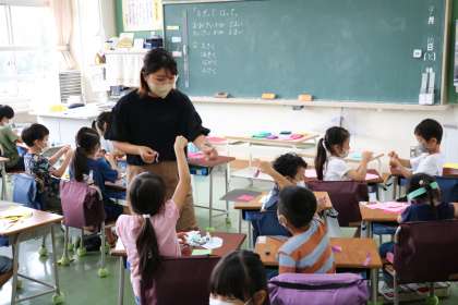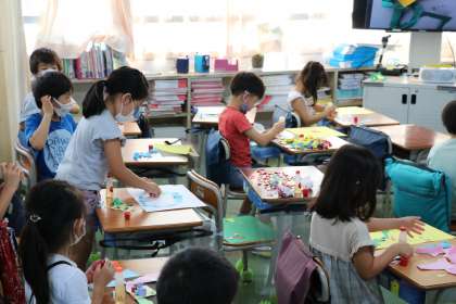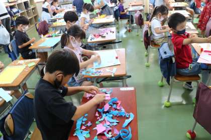 1年生の図工の授業です。「ちぎってはって」をいう作品を作っていました。色紙をちぎって好きな形にして画用紙に貼って作品に仕上げていました。色紙をちぎって自分の思った形にするのは意外と難しかったようです。