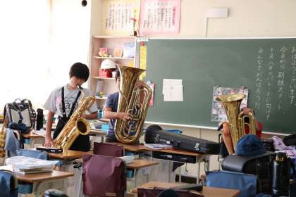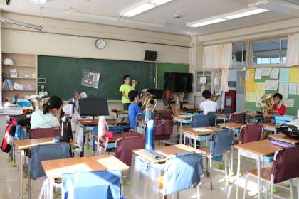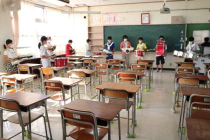 6年生鼓笛朝練習の様子です。久しぶりなので、手、指がなかなかスムーズに動きませんが、がんばっています。