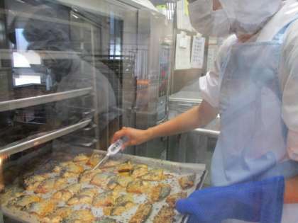 さばはにんにく、しょうが、ねぎとしょうゆ、砂糖、みりんを合わせたものにさばを漬けこんでから白ごまをふって、オーブンで焼きました。焼き上がると香味野菜の香りがしてとても食欲をさそる魚料理です。写真は焼き上がりの中心温度を確認しています。