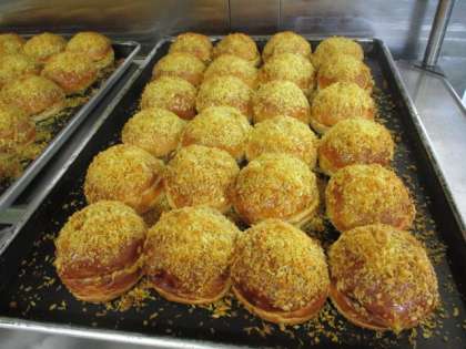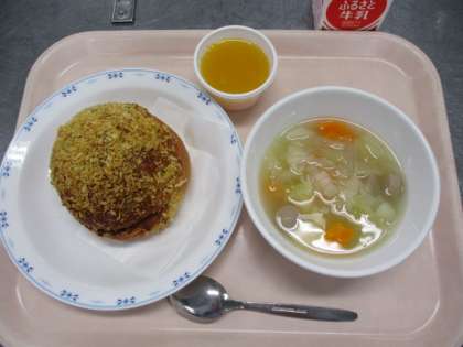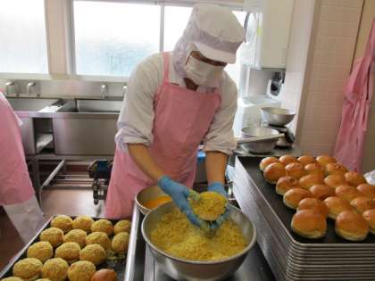 今日は給食室で焼きカレーパンを作りました。ドライカレーを朝一番で作り、