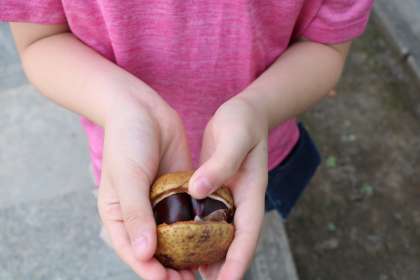 通学途中で「とちの実を拾ったの」と見せてくれました。まだまだ自然あふれるこの地域は、季節を木々や木の実でで感じられて、いいですね。