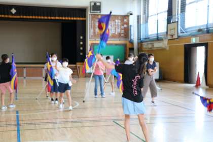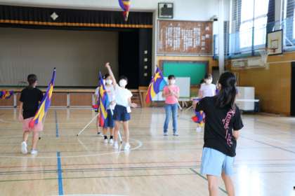 6年生フラッグ練習は、フラッグを空中でパスする練習です。6年生がんばっています。