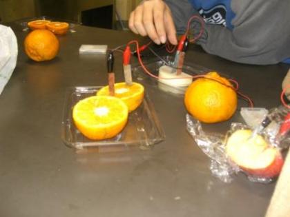 東京電力の方による出前授業で、くだものや野菜の電池作りをしました。子どもたちが持ってきた、リンゴやミカン、ジャガイモなどを使って電池を作り、すてきな音を鳴らす実験を楽しく行いました。