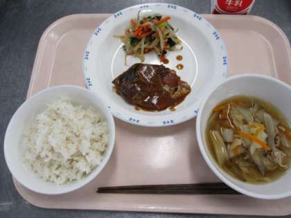 さばは秋から冬にかけてあぶらがのっておいしくなります。今日はさばを給食室の大きな釜でみそ煮にしました。約2時間かけてしょうがとねぎと一緒にコトコト煮たので、臭みもなく味がしみたとてもおいしいみそ煮ができました。こどもたちからも「ごはんに合う」と好評でした。
