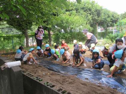 そっと種を置いて、土を被せました。大きく育つように!