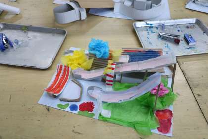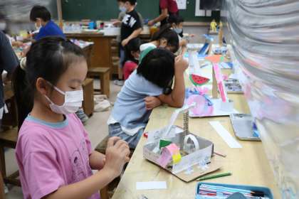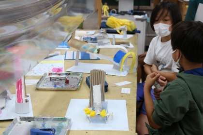 3年生・図工「コロコロアスレチック」の様子です。レールや柱を工夫して、ビー玉がいろいろな転がり方になるよう工夫して楽しいアスレチックができてきました。工作用紙以外の色々な材料を使って飾りを作ったり、絵の具で色を塗ったりして自分だけのアスレチックを仕上げます。