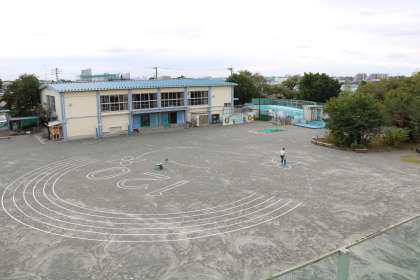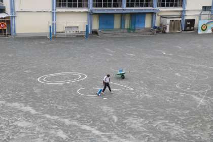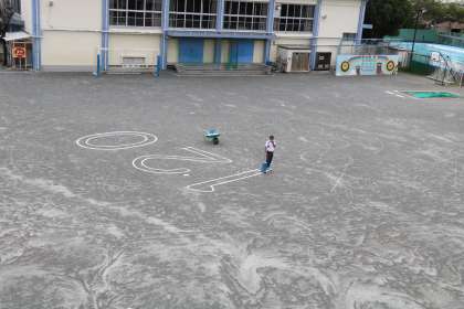 全校児童、先生・主事さんと一緒に文字・絵を作ります。デザインは募集した作品の中から、投票で選ばれた2人のデザインを一つにして決定しました。大きな絵を、2人でどんどん描いていきます。