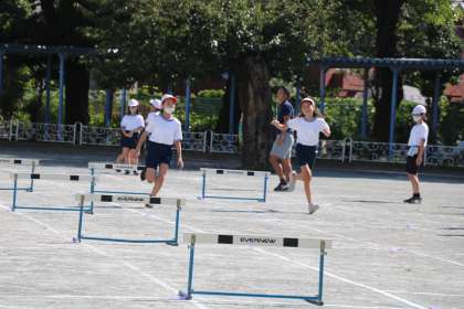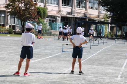5年生体育の様子です。ハードルをまたぎ越す基本の姿勢を確認して、友だち同士見合いながら練習します。