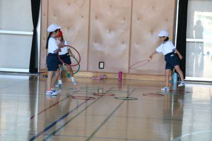 先生は前の時間、跳ぶことの面白さや心地よさを引き出すために、思わず跳んでみたくなる場を工夫して作りました。