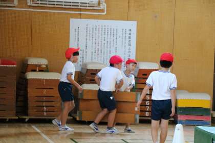 今日は、前の時間に先生が作った場を子供たちの力で再現しています。どの班も、友達同士協力して準備ができています。