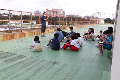 屋上に出て、タブレットで雲の動く様子を録画したり、風の向きを感じたり、雲の形・色・厚さを観察したり。発見したこと、不思議だと思うことを共有しました。