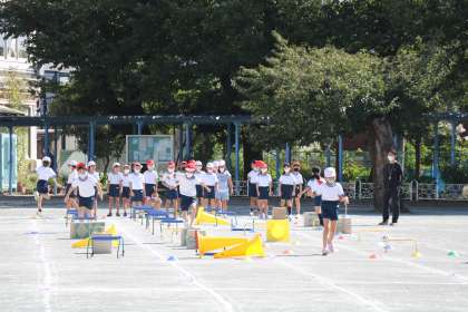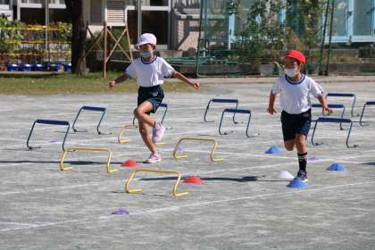 3年生の体育の授業の様子です。今日は、ハードルや障害物を跳び越える運動を行っていました。リズムよく障害物を跳び越えていました。