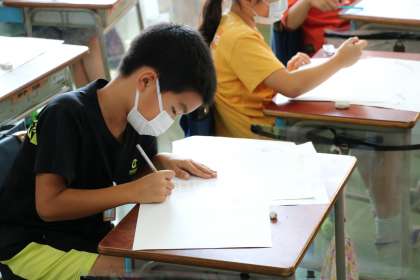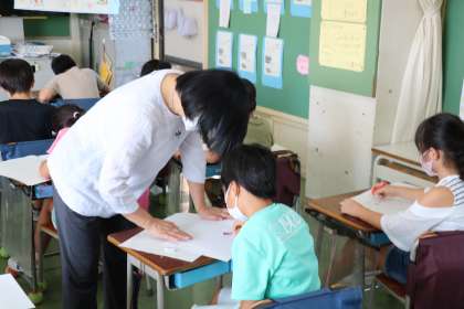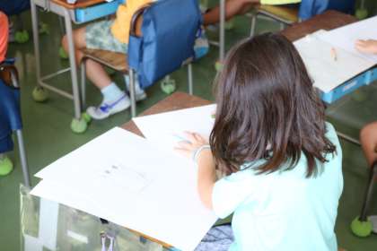 2年生の図工の授業の様子です。今日は版画の版つくりをしていました。自分の好きな物を画用紙に丁寧に鉛筆で描いていました。