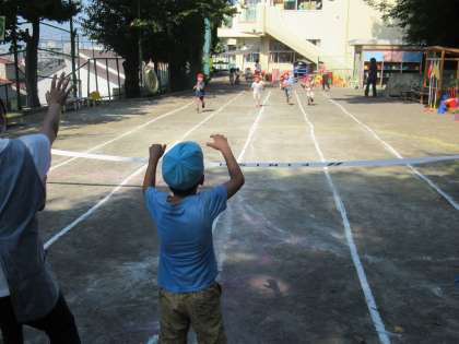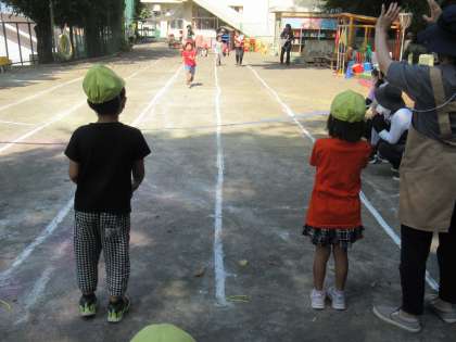 体操の後は行進して自席に戻り、年少組のかけっこです。