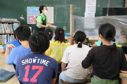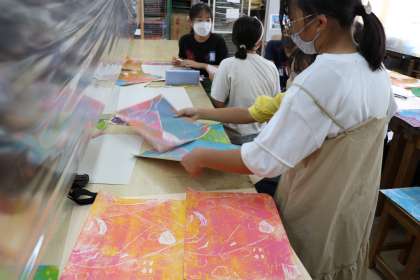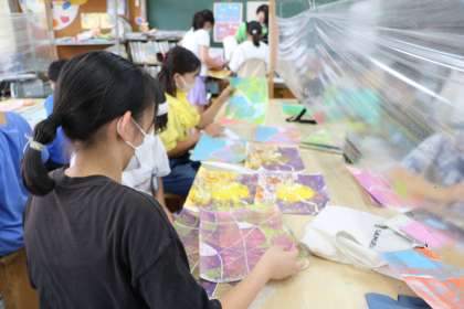 先生の話をしっかり聞き、まずは台紙に自分の作品を張ります。