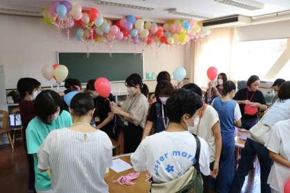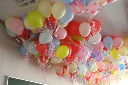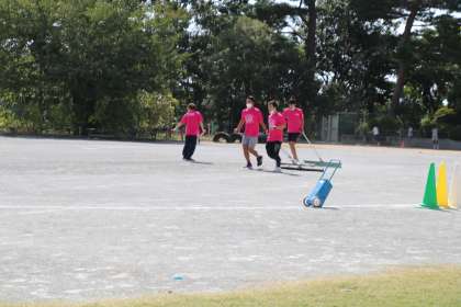 お昼頃になると、バルーンが着々とできてきました。校庭では水をまき、ブラシをかけて先生たちも準備です。