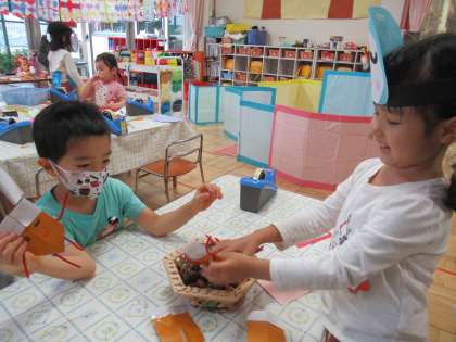 さっそく、どんぐり人形を曲に合わせて動かしたり、友達とどんぐり人形ごっこをしたりして楽しみました。自分で作ったもので遊ぶのはとても楽しいです。