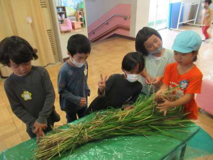 触ってみたり、においをかいでみたり、もって歩いてみたり、少しだけもみを剥いてお米を出してみたり・・。これから、幼稚園でも稲を干してお米になるのを楽しみにします。