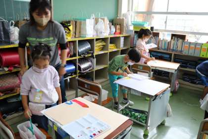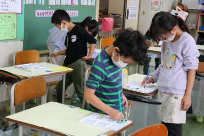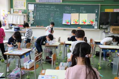 絵具の勉強は、道具の使い方から始まり、もう数時間たちます。最初のころに比べてグッと絵具で絵を描くことが上手になりました。色を混色したり、水で濃度を加減したり、子どもたちは楽しみながら少々緊張気味に絵を描いています。