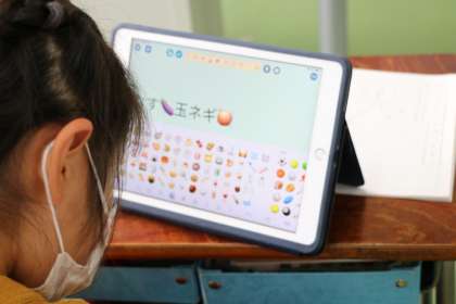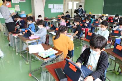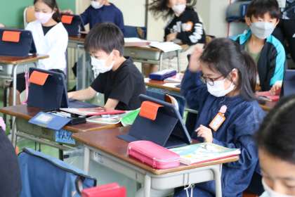 「なかまのことばあてクイズ」を一生懸命考えています。できたクイズは、ノートに書いたり、タブレットで提出箱に送ったりします。