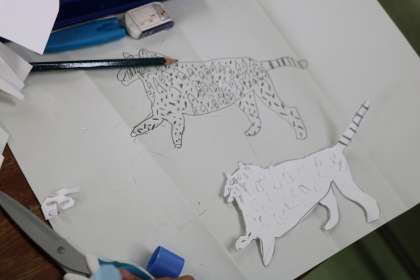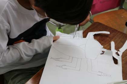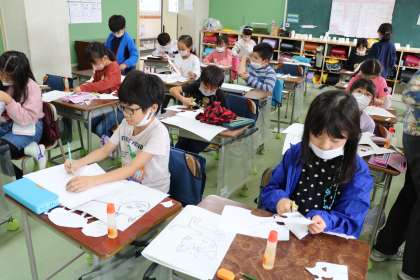 2年生図工「紙はんが」の様子です。アイディアスケッチも上手ですが、そのスケッチを版に仕上げるのも上手です。お喋りもなく、細かい作業を一生懸命がんばっています。