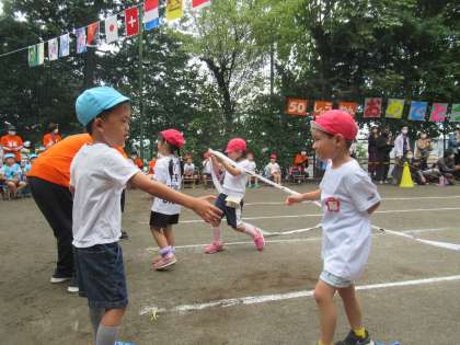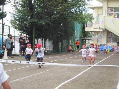 年長さんの係が、ゴールテープを持ったり、ゴールで年少さんを迎え入れて席まで誘導したりしてくれました。