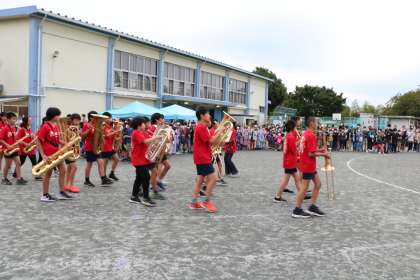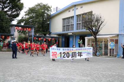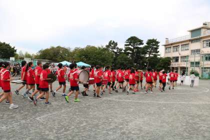 6年生がパレードから戻ってきました。いよいよ砧っこ夏祭りの開会式です。