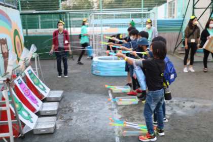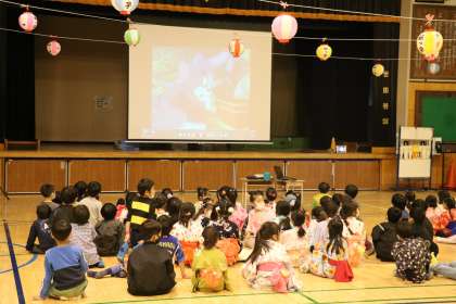 開会式の後は、学年ごとに「盆踊り」「遊びブース」「体育館シアター」に分かれて楽しみました。盆踊りでは、踊りの師匠の地域の皆さんにも一緒に踊ってもらいました。ありがとうございました。