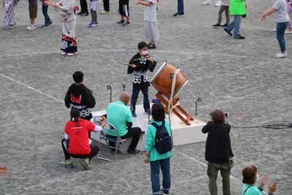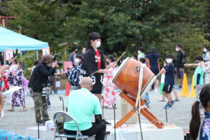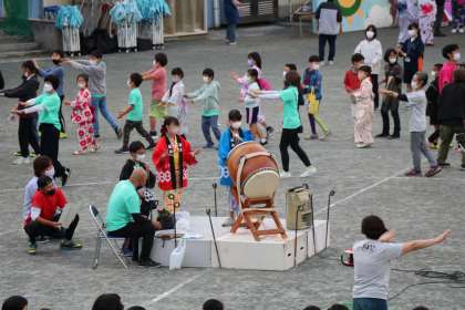 盆踊りでは、太鼓演奏を児童が行いました。太鼓の先生に教えてもらった成果を出せたようです。